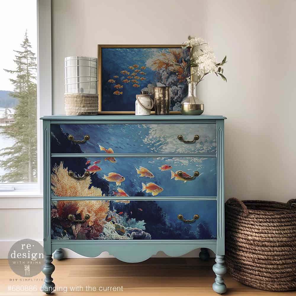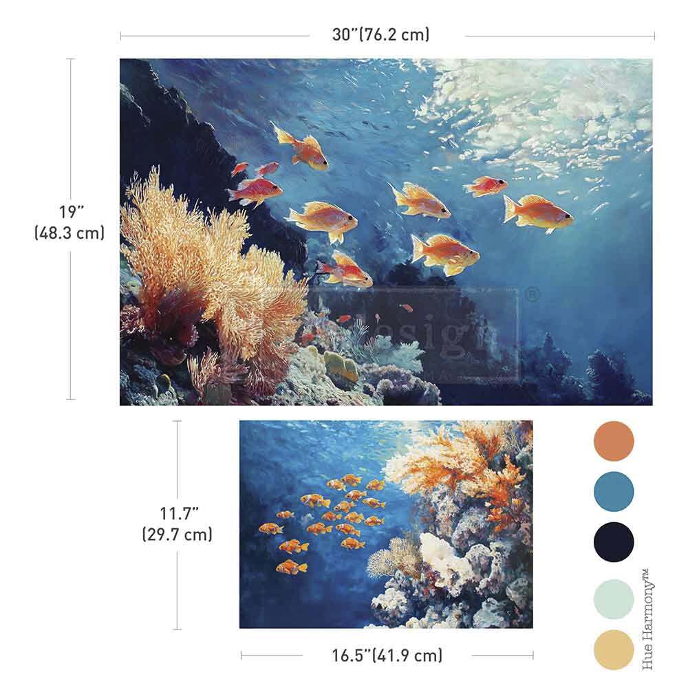 A vibrant underwater scene featuring soft coral reefs and a graceful school of orange fish swimming through shimmering blue waters. Light beams filter from above, adding depth and movement to the design.