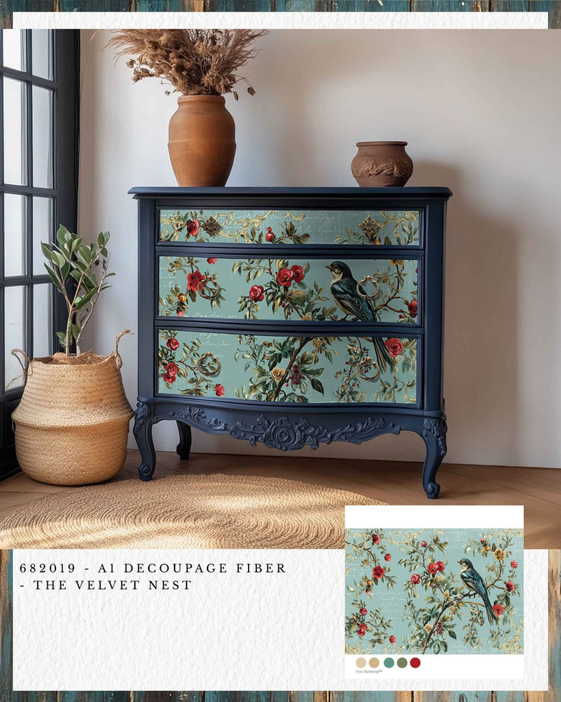 Soft, painterly detail meets rich holiday hues in The Velvet Nest. With its graceful birds nestled among berries and branches, this A1 fiber sheet is ideal for statement furniture panels, canvas art, or wall décor. Durable yet delicate in look, it delivers an effortlessly festive vibe.