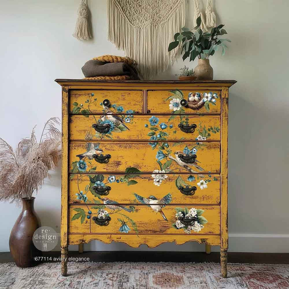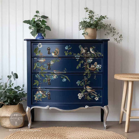 Lively birds in flight, blooming florals, and fresh greenery come together in Aviary Elegance Decor Transfers®, a vibrant transfer full of movement and charm. Each element feels hand-painted, with soft blues, creamy whites, and natural browns that bring depth to dressers, cabinets, and wall art.