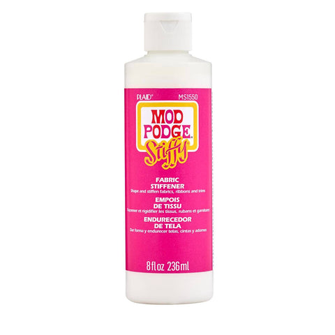 Add dimension to your next fabric project with Mod Podge Stiffy. This unique fabric glue stiffener is perfect for stiffening a variety of fabric arts and crafts. Mod Podge Stiffy makes fabric less flexible and can be applied directly onto all types of fabric surfaces such as cotton, cheesecloth, burlap, gauze, laces, ribbons, needlework, and felt. It is quick and easy to work with and is sure to make your crafts stand out. Simply pour a small amount into a bowl and completely immerse your fabric. Then squeeze out the excess and position your wet fabric either flat or over a plastic wrap covered shape and let dry. Make Mod Podge Stiffy a key part of your art supplies to give your fabric projects shape!