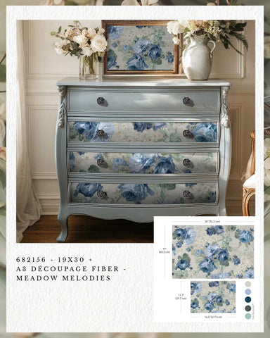 Soft layers of painterly blues and muted meadow greens drift across Meadow Melodies, creating a tranquil floral tapestry that feels both vintage and modern at once. This Double Delight Set includes two coordinated fiber decoupage sheets—one large and one medium—each featuring sweeping blue roses, delicate wild blooms, and faint collage-like textures reminiscent of aged botanical pages. Printed on high-quality fiber paper, these sheets adhere beautifully to furniture fronts, drawer panels, trays, canvases, wall décor, and mixed-media surfaces with minimal wrinkling and a smooth, luxurious finish. Whether you're designing a romantic statement piece or adding subtle floral depth to home décor, Meadow Melodies brings serene elegance to every project.