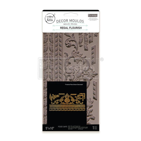 Classic scrolls, acanthus leaves, and a beautiful central crest, the Regal Flourish Décor Mould® is made to add instant grandeur. With multiple sizes of twisted rope trims and ornate borders included, this mould is perfect for framing décor, embellishing furniture edges, or layering over seasonal mixed media.
