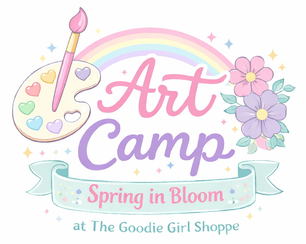 Art Camp at The Goodie Girl Shoppe is a week-long creative Spring Break experience for school-aged children (elementary through middle school). Camp runs Monday through Friday from 9:00 AM to 12:30 PM, with an optional extended hours add-on available.